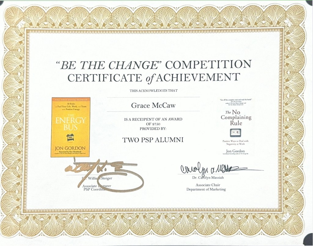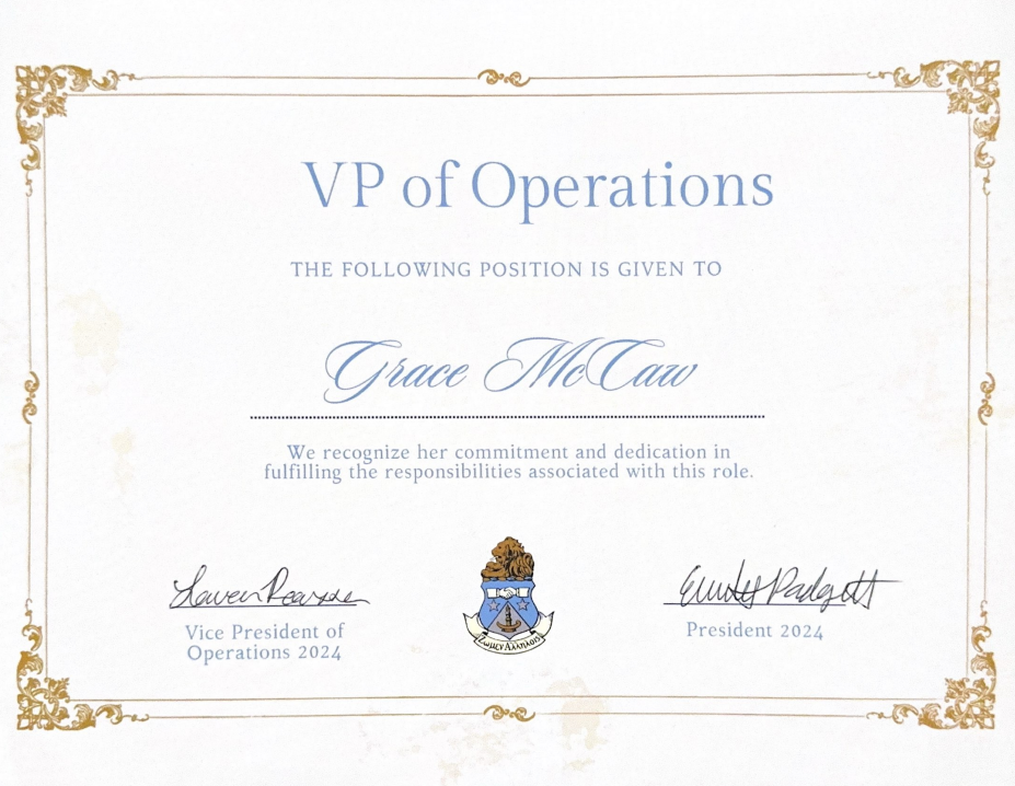 “I’ve had the honor of working with Grace on my sororitys executive board, she consistently shows up and makes sure everyone is supported and informed within their roles in our chapter. She always takes initiative in keeping the executive team connected and ensures we’re all kept to date on concerns, always leading our group to feel comfortable when working together. Her communication helps us make decisions smoothly and stay focused as a group in order to operate the best for our chapter!”